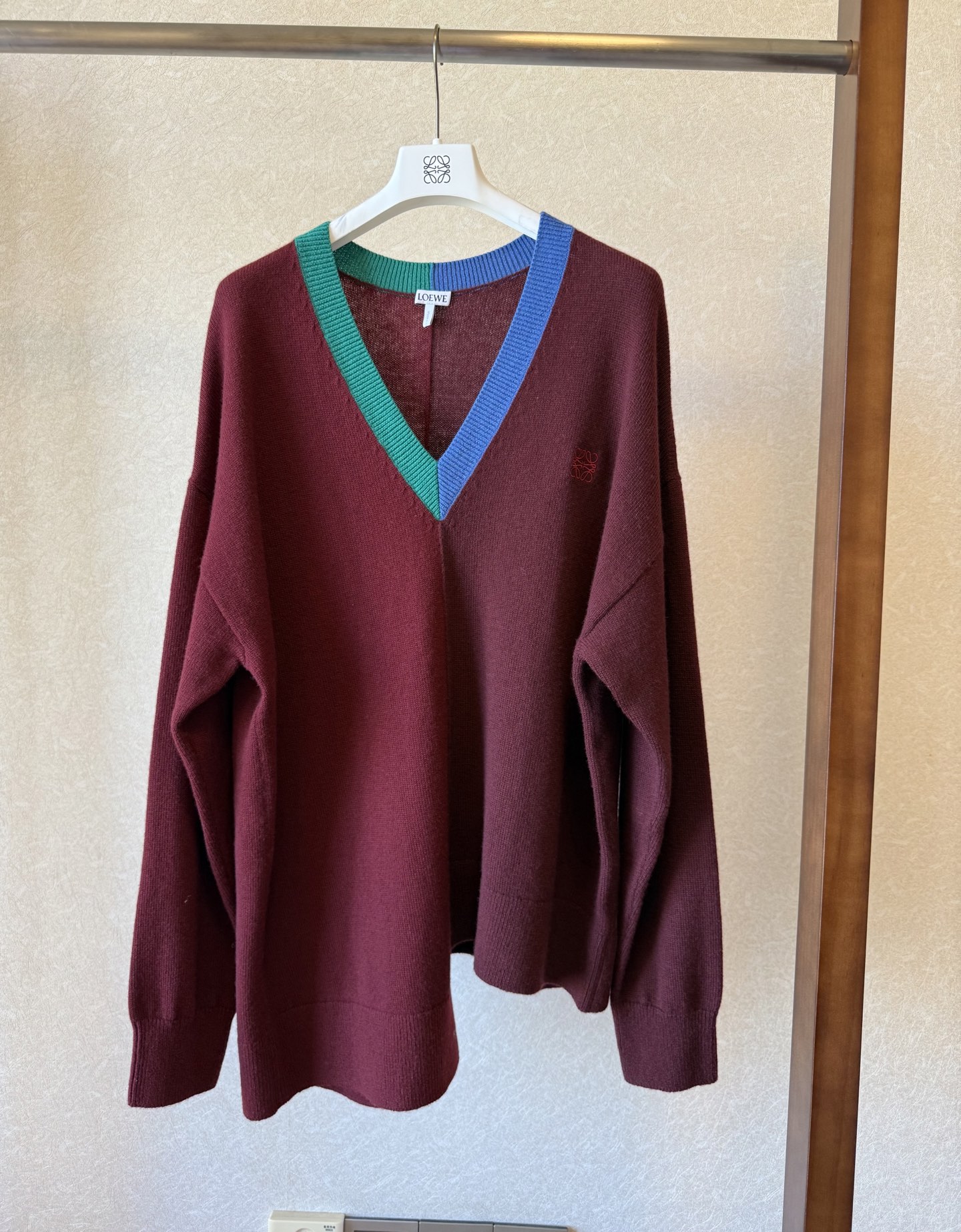 Asymmetrical Wool Sweater with V-Neck and Contrasting Colors