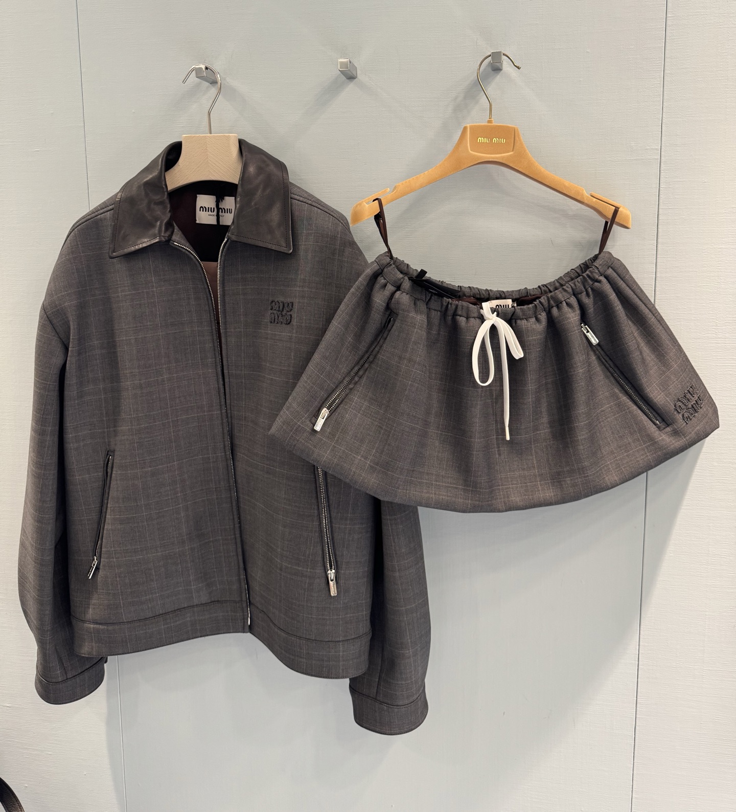 This chic set includes a plaid jacket with a unique lambskin collar and a matching drawstring skirt, perfect for a fashionable and comfortable look.