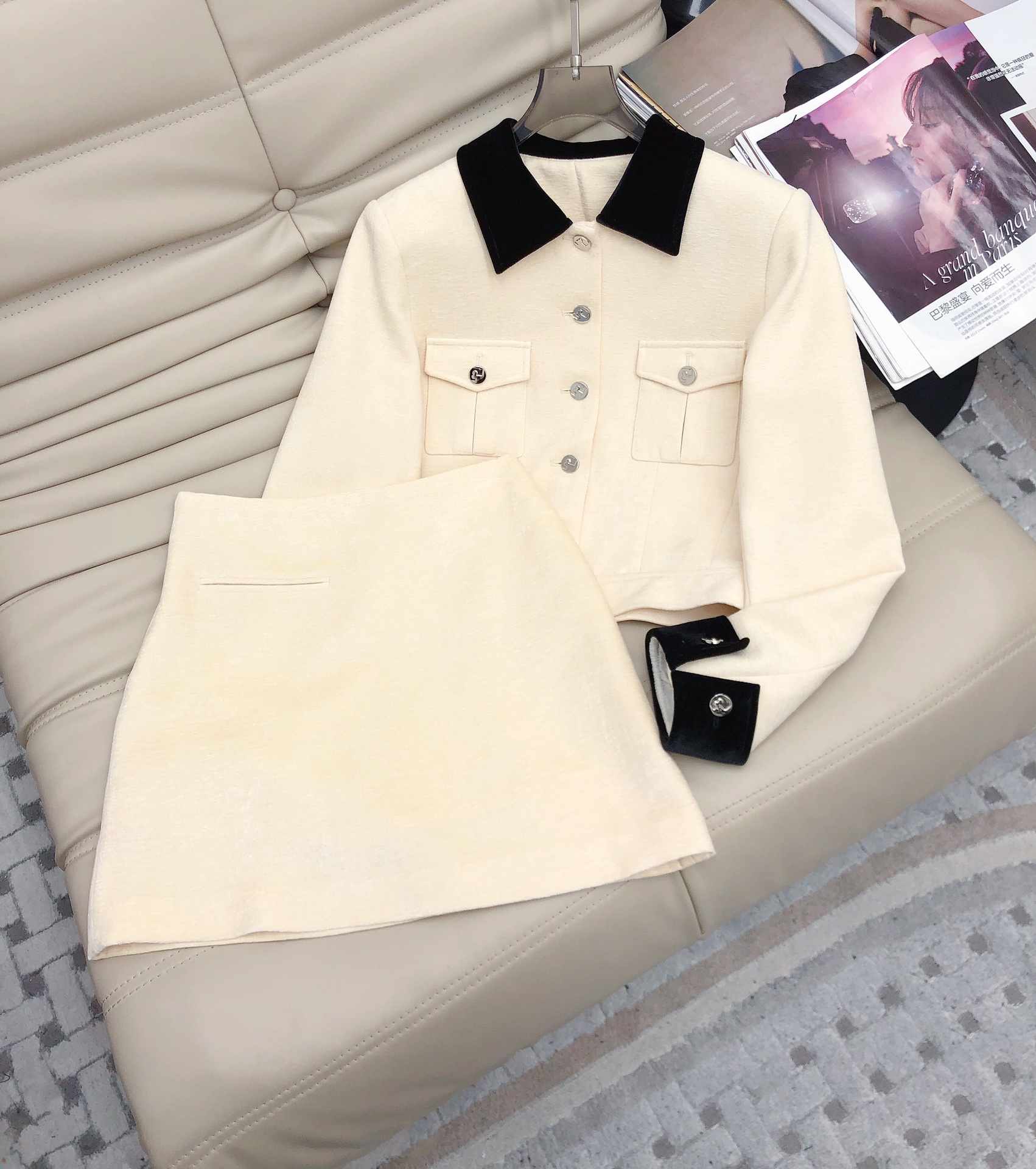 Wool Blend Skirt Suit with Velvet Collar, Retro Style, Slim Fit